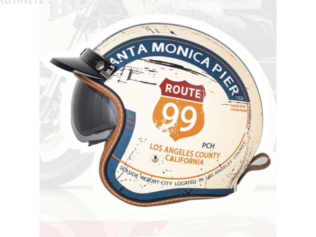 Design Retro Atemporal: O fuziune între estetica vintage și elementele moderne. Cască cu linii elegante și detalii contrastante maro ale căptușelii și marginii, disponibilă în variante de culori iconice – negru clasic lucios sau mat, alb curat și crem unic cu dungi retro (Route99).