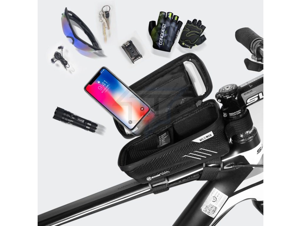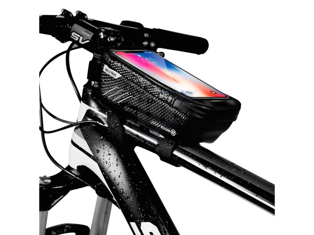 Husă sau suport impermeabil WILDMAN pentru cadru de bicicletă pentru a vă proteja telefonul și obiectele personale. Suportul poate găzdui toate telefoanele cu lățimea de până la 8 cm și vă va proteja telefonul de ploaie. Acest lucru este ajutat și de fermoarul impermeabil care vă fixează telefonul în suport. Datorită curelei de fixare, suportul este bine fixat pe cadru, astfel încât telefonul sau suportul nu vor cădea atunci când mergeți pe off-road. De asemenea, veți găsi o pungă de depozitare de1 litru sub husă. Suportul este fabricat dintr-un material PU modern care arată și se simte ca pielea, astfel încât husa are un aspect premium.