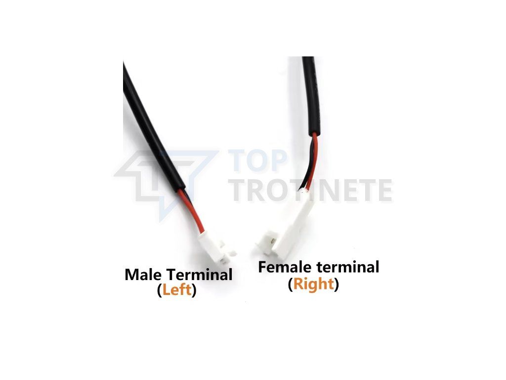 Compatibilitate cheie (Versiunea A): Această semnalizare este destinată trotinetelor cu instalație electrică de tip A, care utilizează conectorul alb cu 2 pini (comparați cu imaginea detaliată "Male/Female"). Înainte de achiziție, verificați cu atenție tipul conectorilor de pe trotineta dumneavoastră.