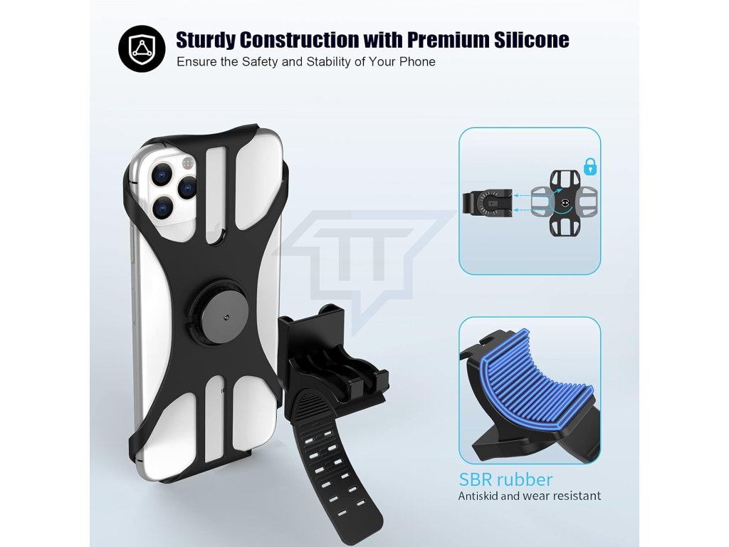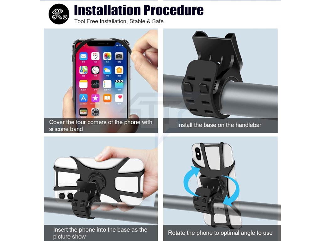 Suportul universal are, de asemenea,curele elastice reglabile din silicon care îi permit să se potrivească diferitelor tipuri de ghidon cu diametrecuprinseîntre 18 și 35 mm. Acest lucru înseamnă că este potrivit nu numai pentru biciclete și scutere, ci și pentru ghidonul motocicletelor, cărucioarelor. Indiferent de teren și condiții, suportul prinde ferm ghidonul și rămâne stabil, asigurând siguranță și confort în utilizare.
